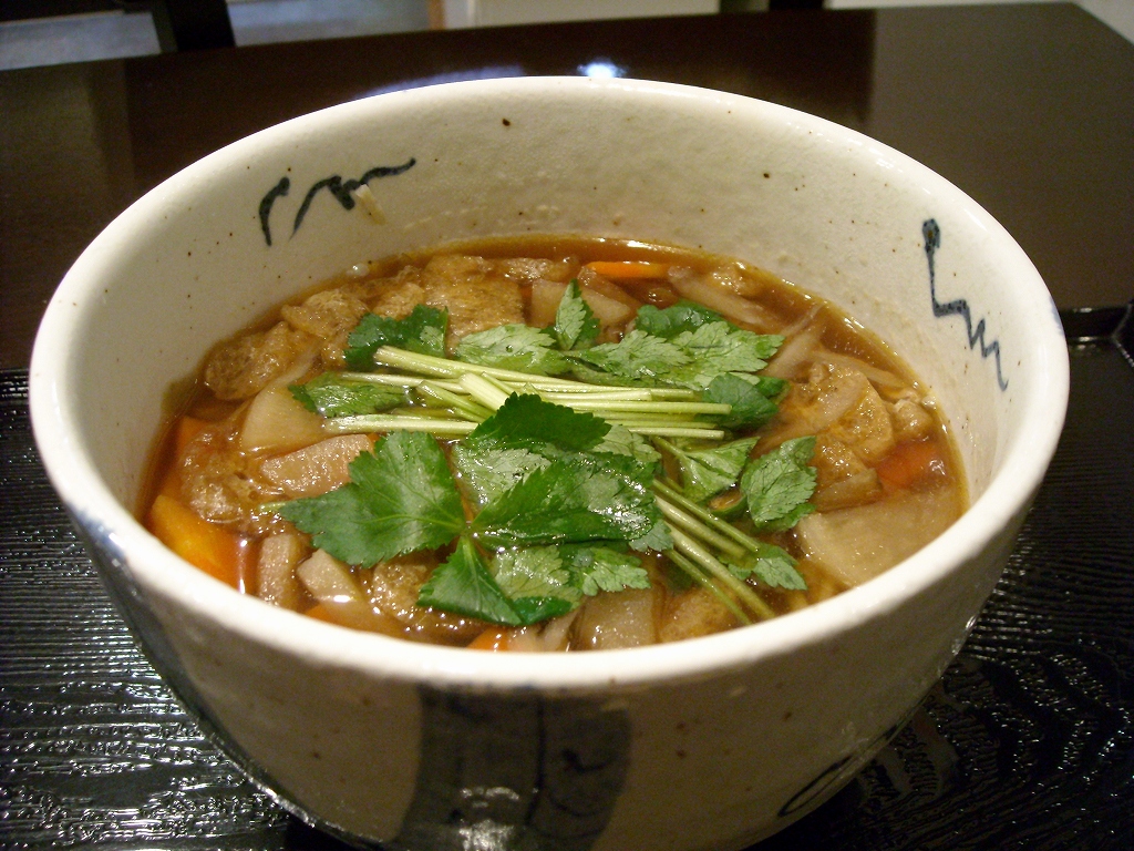 牛蒡、人参、大根などのたっぷりの野菜を胡麻油で炒めてからお揚げを加え、