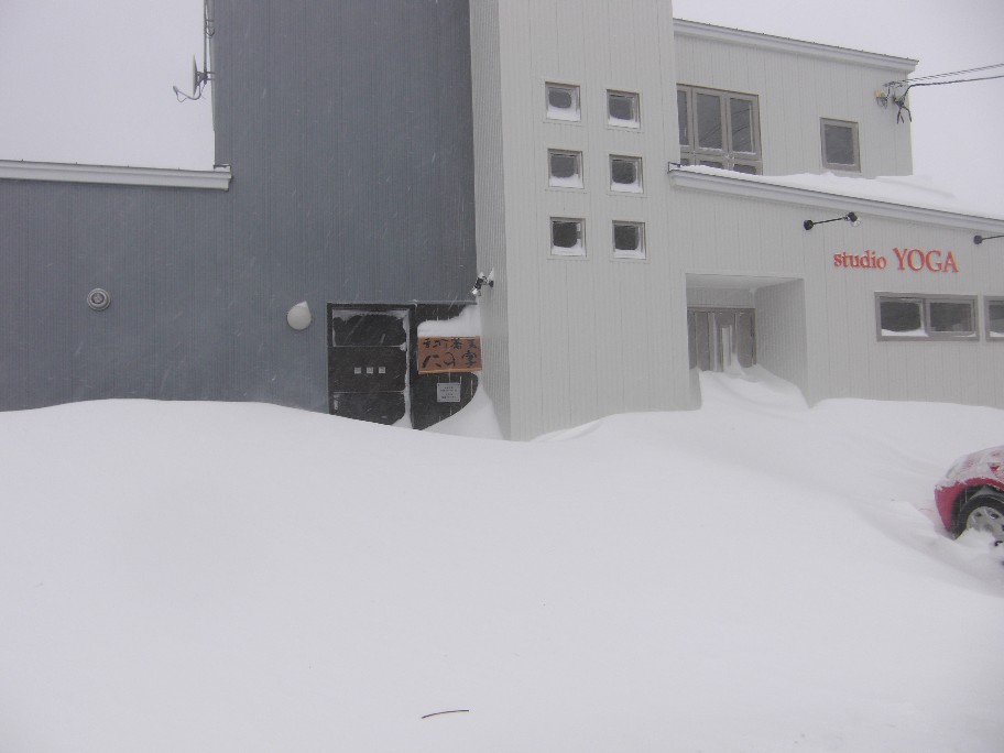 余りの風の強さに駐車場の積雪はほとんど無し、その代わり自宅の玄関、蕎麦屋の玄関共に胸までの吹き溜まり。おまけに店の前の市道は除雪車の通った形跡がありません。